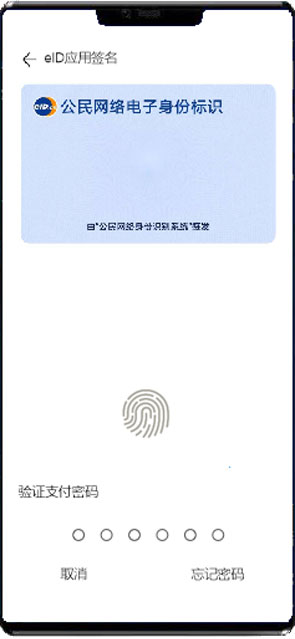 eID签名,即应用App向用户提供待签业务数据(如:授权、协议、账单等),用户使用eID载体内的私钥对待签内容进行签名,表示用户本人对待签业务数据的确认。验证通过后的结果数据可作为电子证据留存。